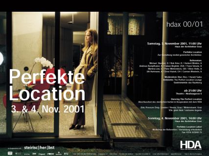 Eine Perfekte Location am Körper, im Lebensraum und in den Medien wird explizit und implizit versprochen. Der Gestalter ist zugleich Regisseur, Designer und Programmierer dieser neuen Wohnlandschaften und muss sich umfassende Kompetenzen zur Bedürfnisbefriedigung postmoderner Individuen aneignen. Im Zuge eines Symposions, eines Labors sowie begleitender Settings wurden verschiedene Themenskizzen der "Perfekten Location" untersucht: New Urbanisme, Framing societies, New Surfaces, Global Media Engineered Housing, Virtual Paradises, Arch-Directors.